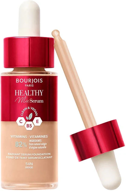 Tonal face foundation Bourjois Healthy Mix Clean and Vegan Serum 54 Biege 30 ml - discover the power of the serum in combination with the coverage of the base. The texture is enriched with cranberry extract, a natural anti-wrinkle agent that tones and smooths the skin, combined with a vegan and pure medium coverage foundation for a visibly even and radiant complexion.