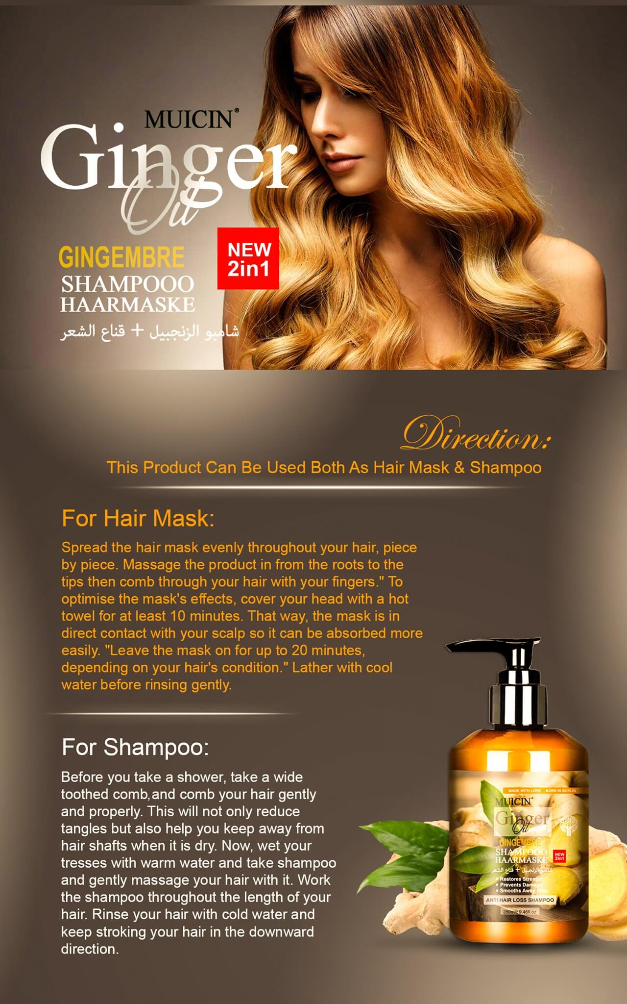 Muicin ginger oil shampoo haarmaske regenerates and protects damaged and chemically treated hair. It has Certified Organic Natural ingredients in order to restore and maintain your hair’s healthy glow from within. Feel nourishing and perfsect texture while maintaining the natural balance of the hair.