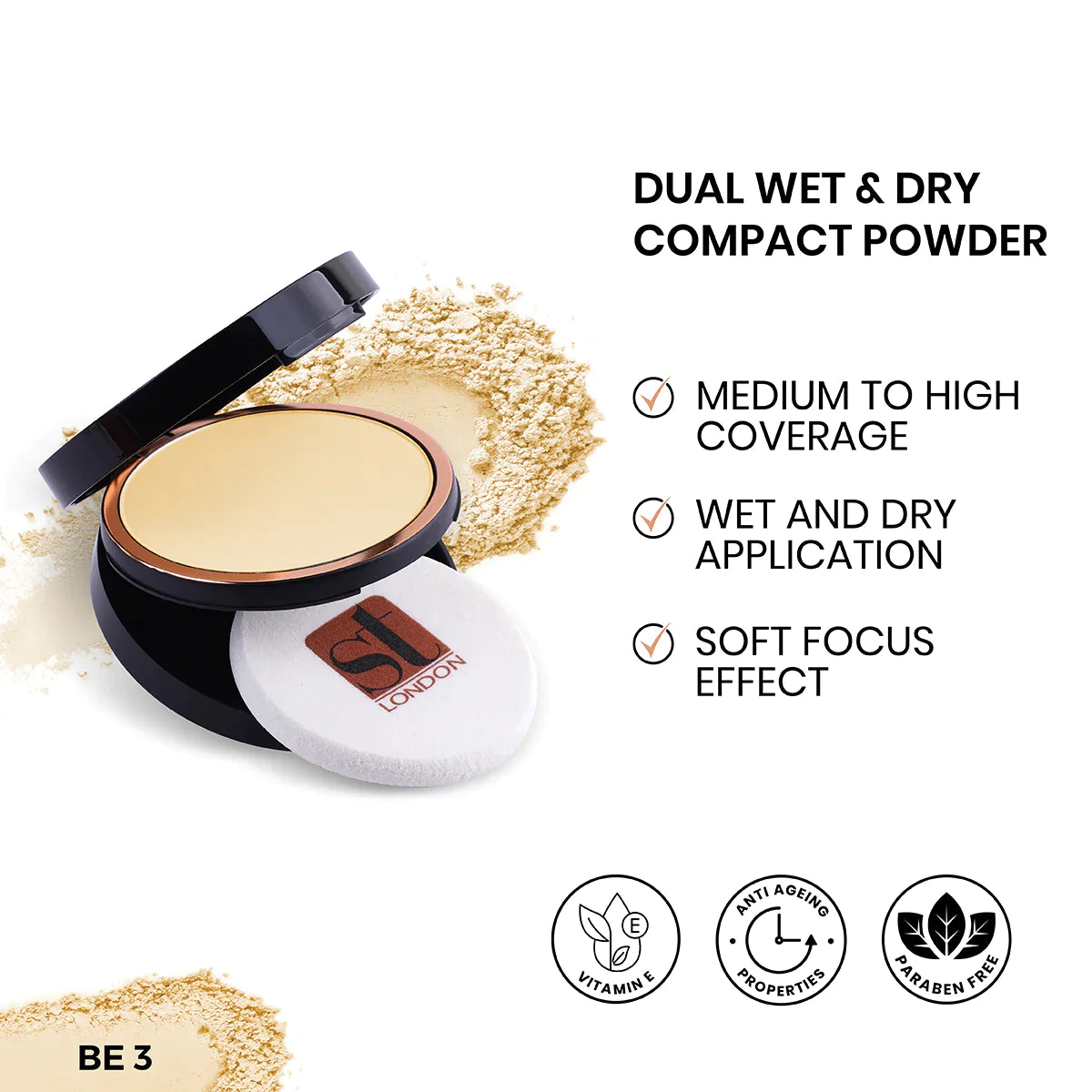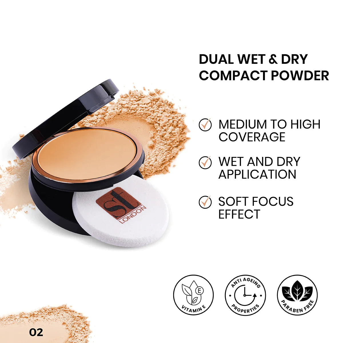 To use dry, apply the powder using the sponge included at the bottom. This will give a lighter coverage. To achieve fuller coverage, use with a damp ST London makeup blending sponge.