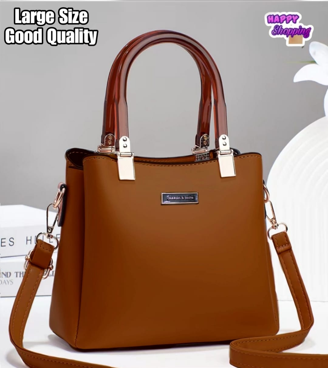 Experience the luxurious quality of this high-quality shoulder bag by Charles & Keith, featuring an imported acrylic handle and a variety of stylish colors to choose from. The bag also includes front brand logo, inside zipper pockets, and a long strap for added convenience. Made with premium Rexgine material, this bag is a must-have for any fashion-forward girl. Don't miss the real video showcase to see its quality for yourself!