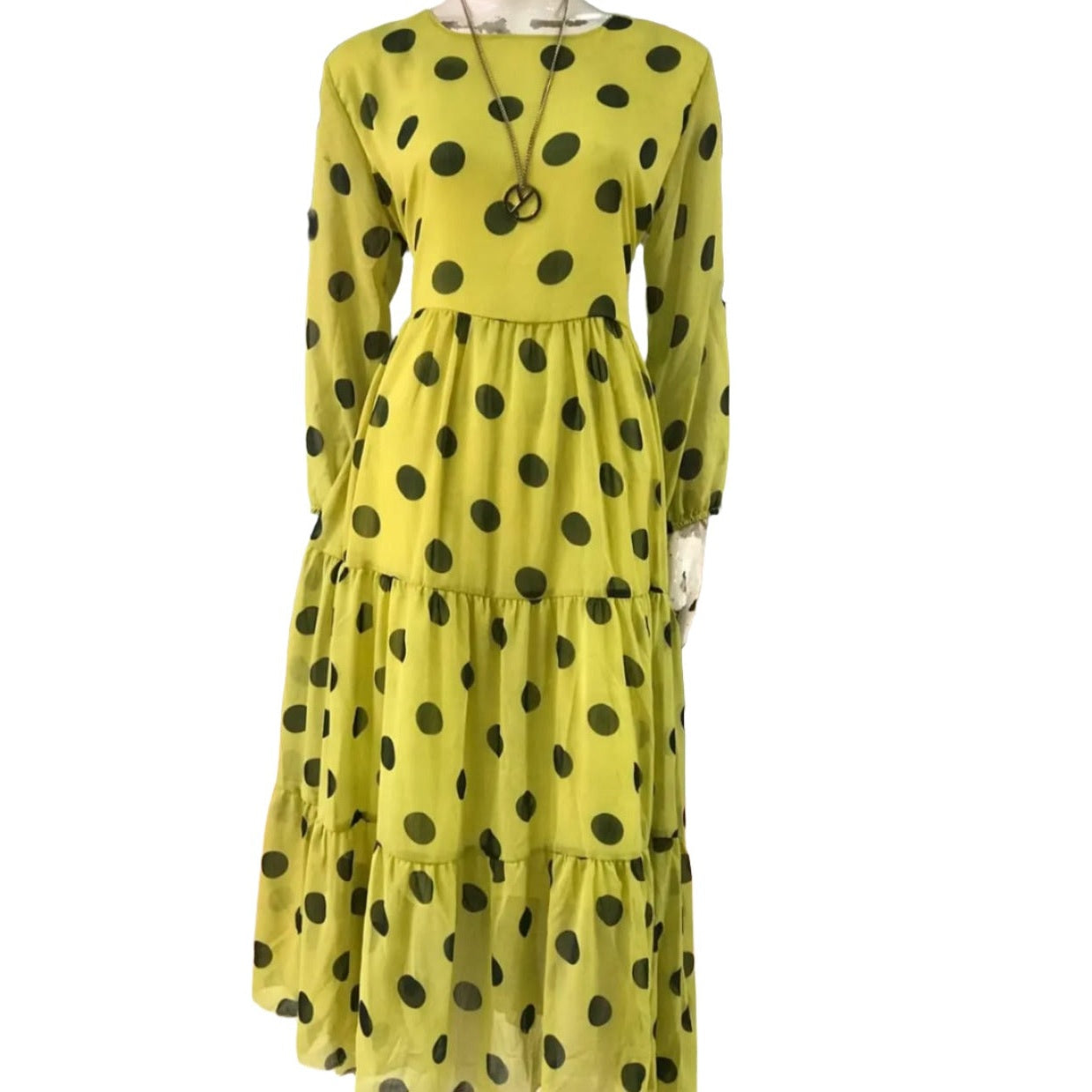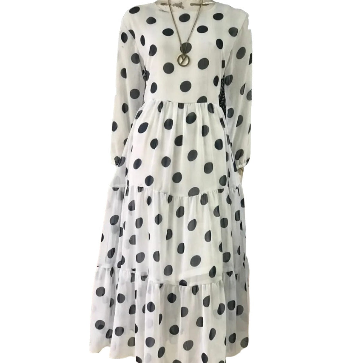 This chiffon dress features a playful big dots print. Made with high-quality material for a comfortable and stylish wear. Perfect for any occasion, this dress will elevate your wardrobe with its playful design. Dress it up with heels or keep it casual with flats. Experience fashion and comfort with this dress.