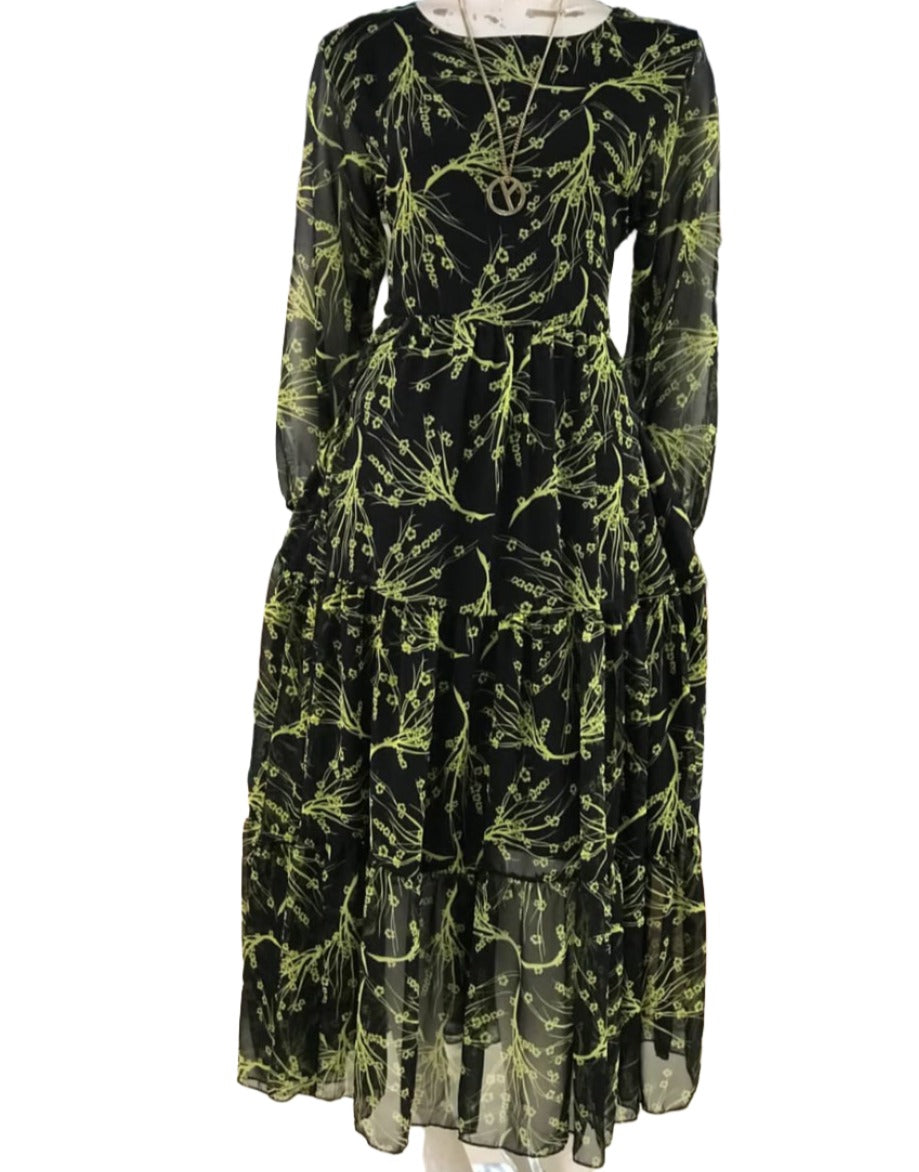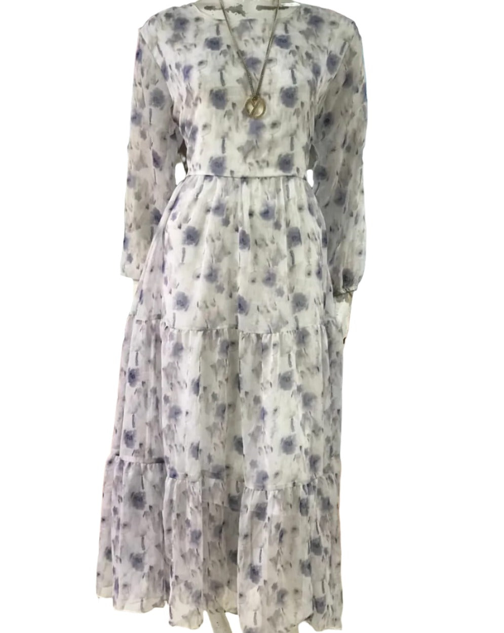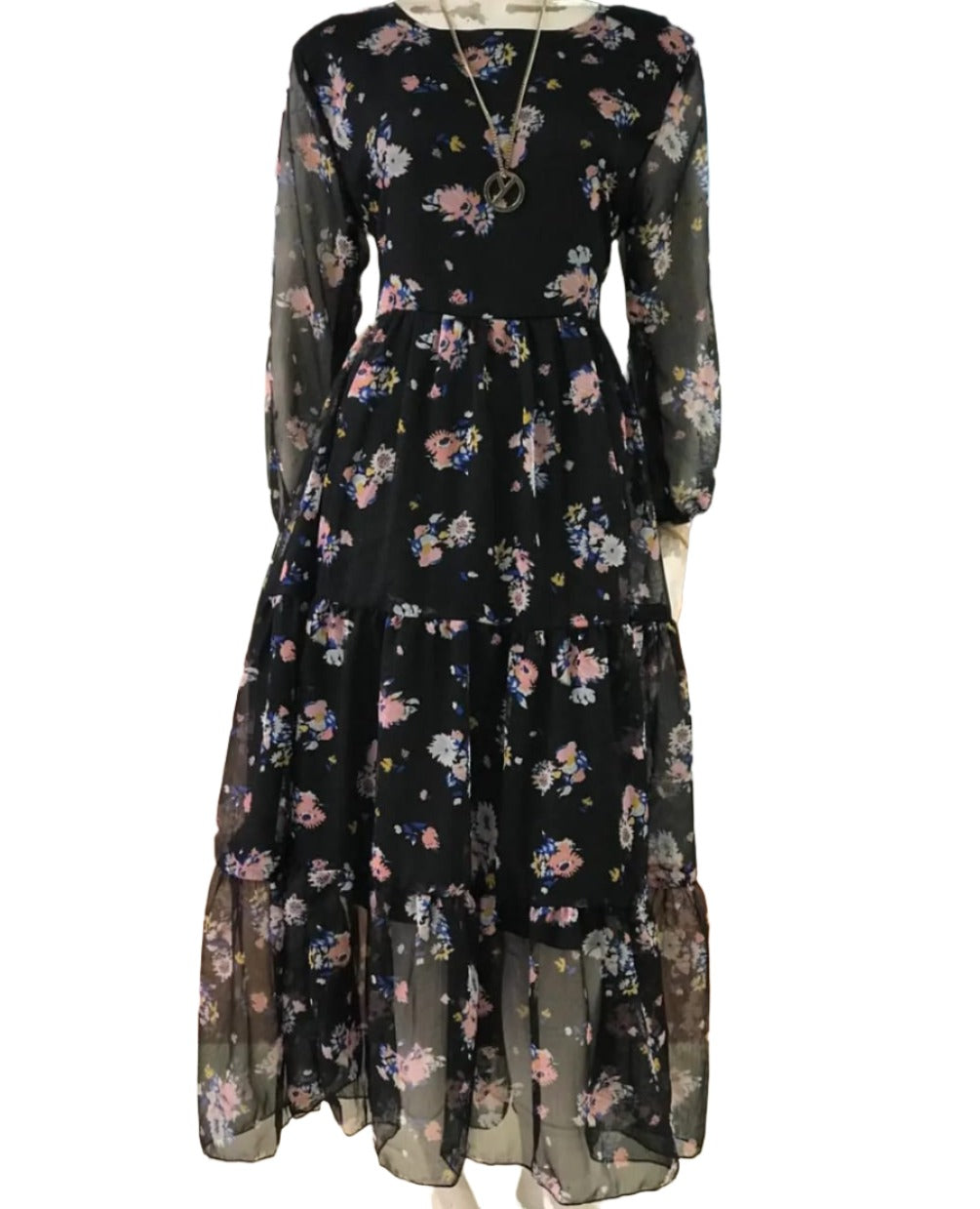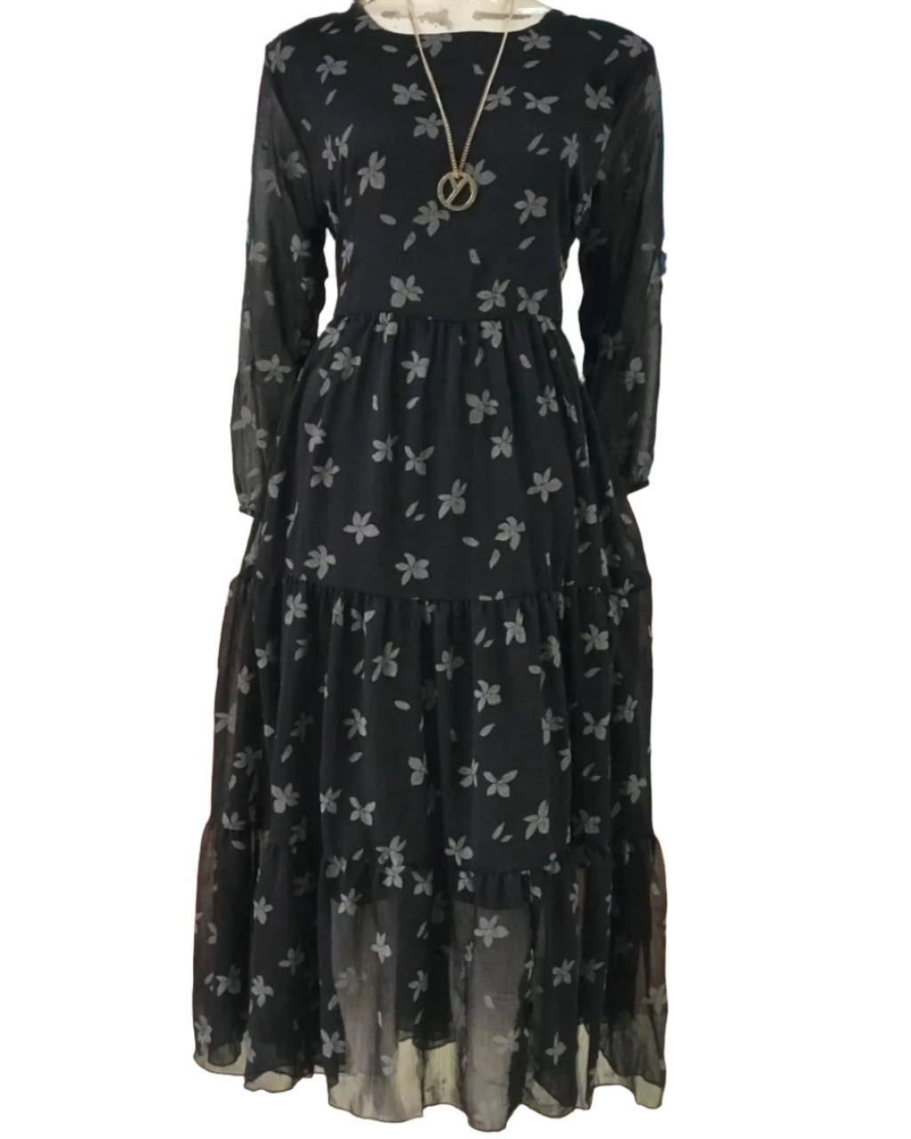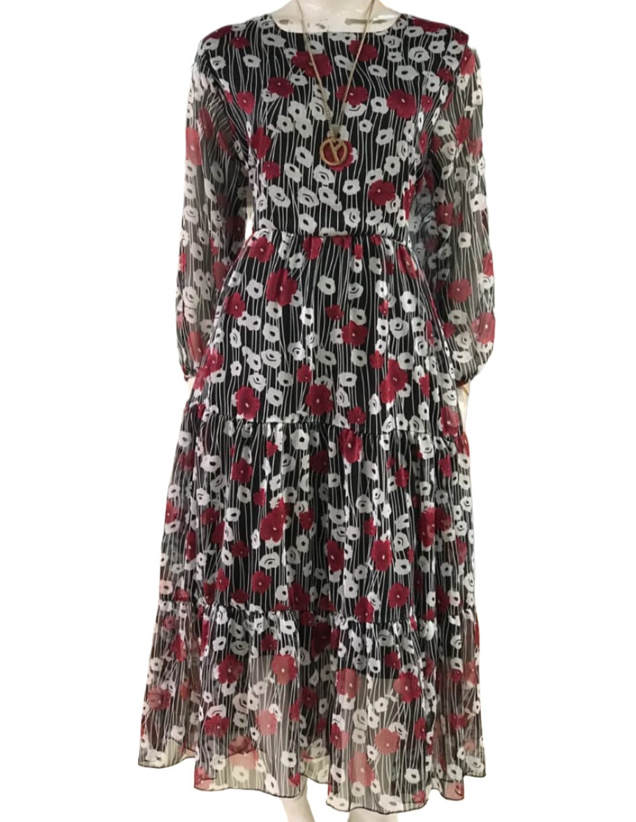 This chiffon dress features a playful flower print. Made with high-quality material for a comfortable and stylish wear. Perfect for any occasion, this dress will elevate your wardrobe with its playful design. Dress it up with heels or keep it casual with flats. Experience fashion and comfort with this dress.