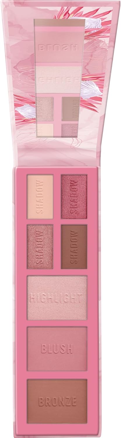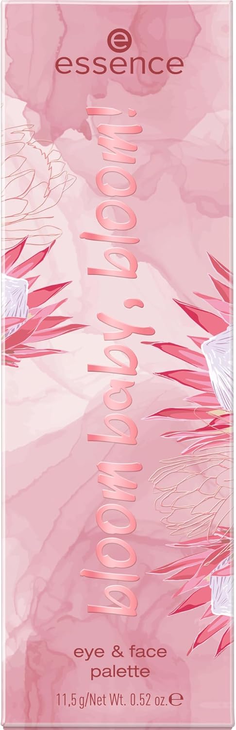 The essence bloom baby, bloom! eye & face palette is eyeshadow and face palette in one, and its integrated mirror make it perfect for a touch-up on the go. Four highly pigmented eye shadows create natural eye looks. Highlighter, blush and bronzer with silky-soft textures create a fresh complexion.