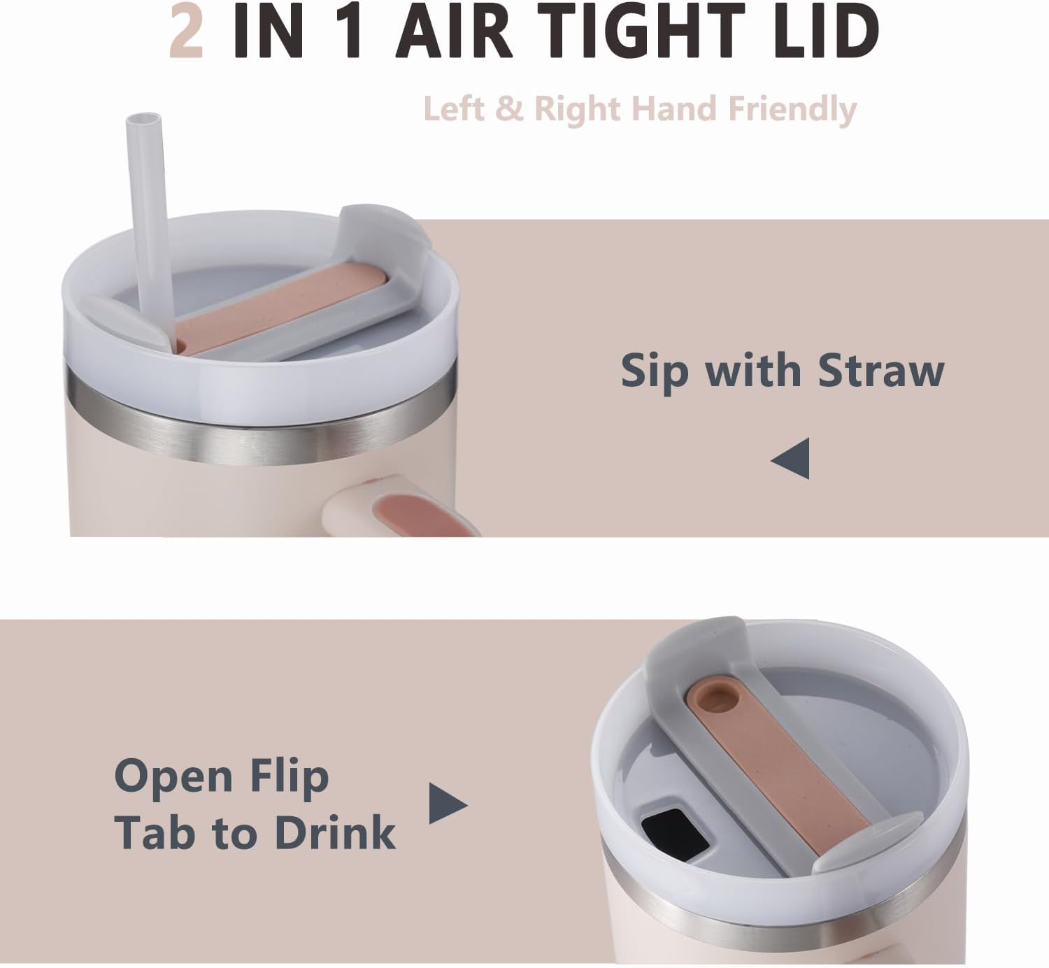 Lid Construction: We have developed an advanced lid, featuring a rotating cover with three positions: a straw opening designed to resist splashes with a seal that holds the reusable straw in place, a drink opening, and a full-cover top for added leak resistance. We’ve also included an ergonomic, comfort-grip handle that makes this the perfect travel coffee cup or water tumbler.