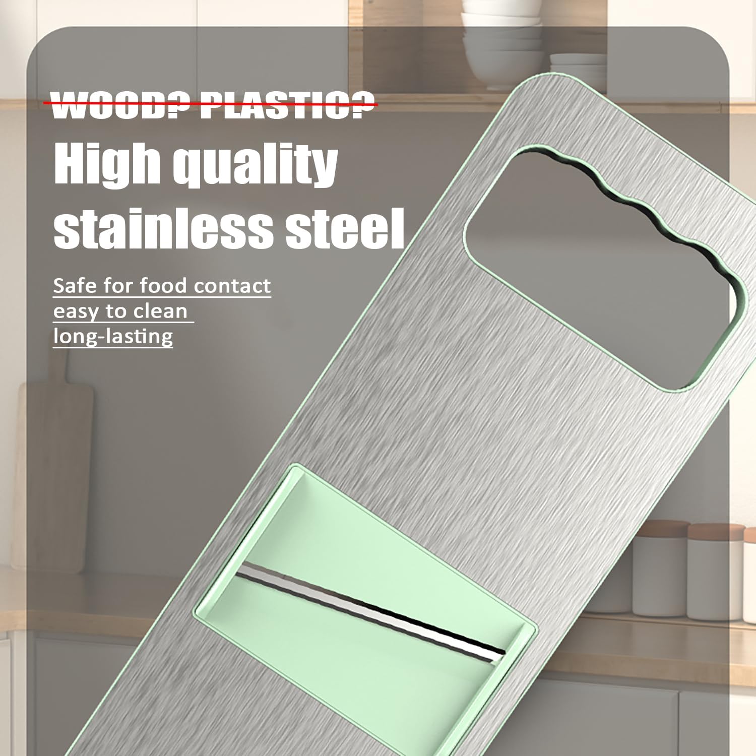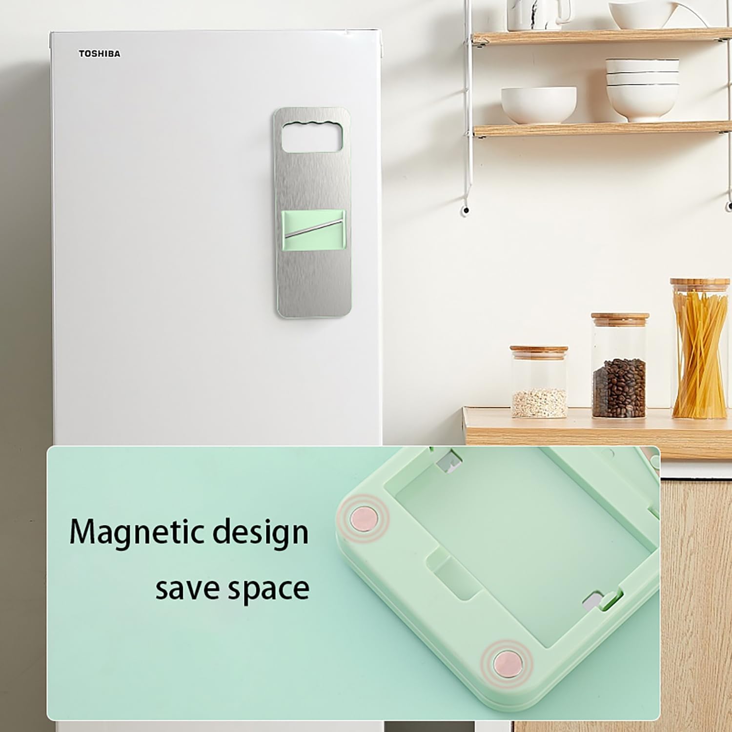 ✔INNOVATION DESIGN: Professional vegetable slicer features humanized design, using sturdy and long-lasting stainless steel panel, magnetic on the back for attached to the fridge. Hand guard of food processor keeps your safe, ergonomic grips and collection tray with non-skid base ensure good stability and prevent food from falling during slicing.