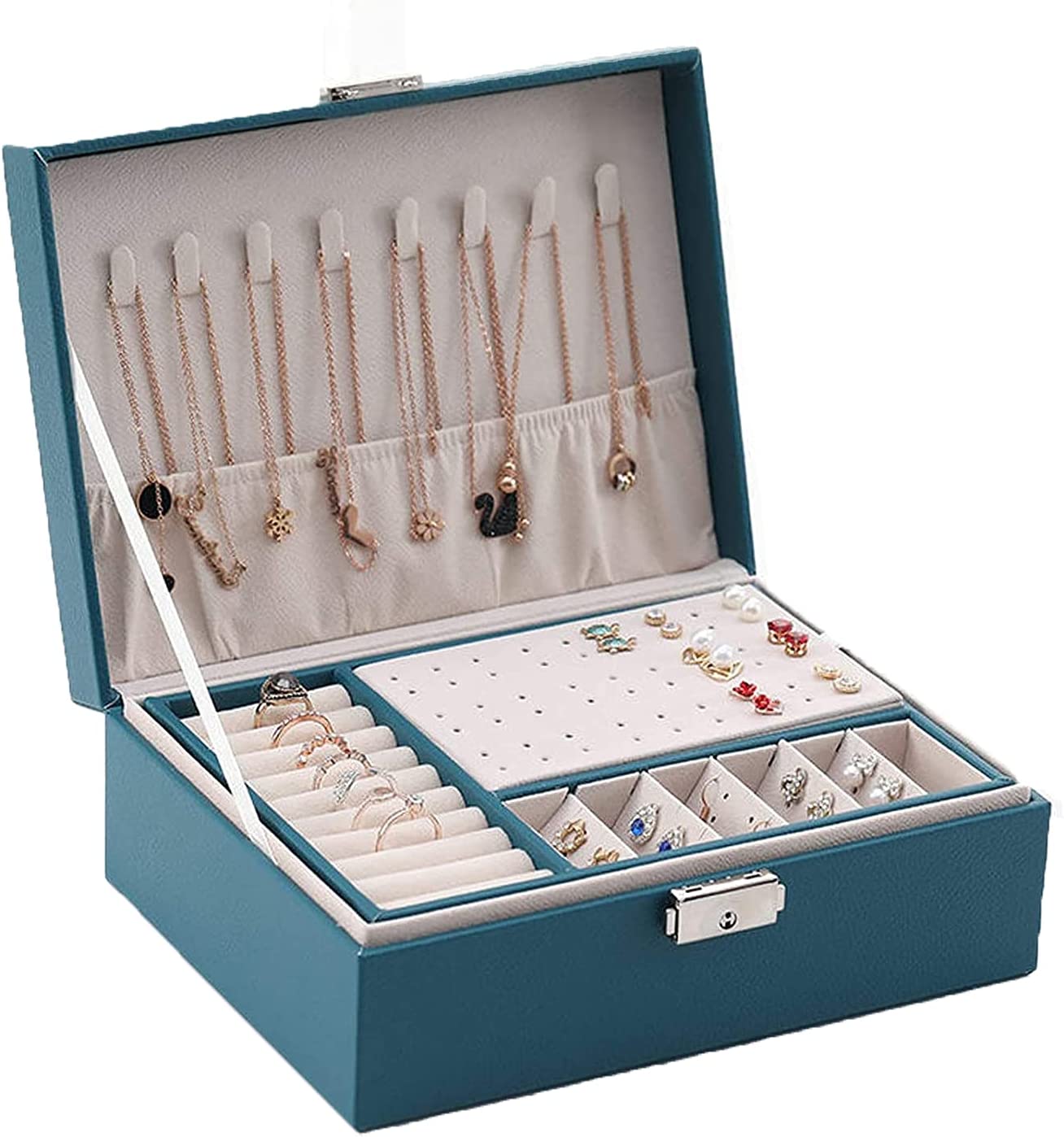 There are 2 layers of jewellery storage box, enough for all accessories. Earrings, rings and watches are placed in different compartments.