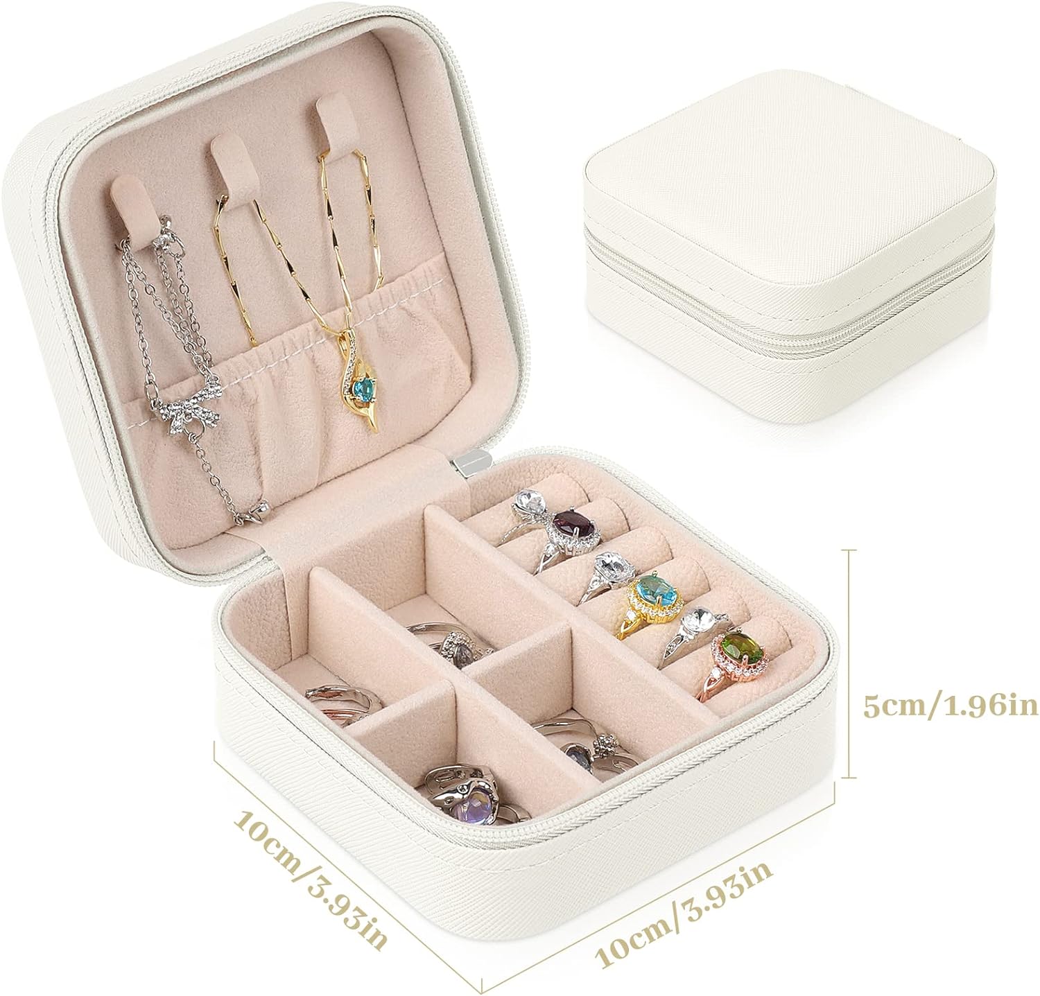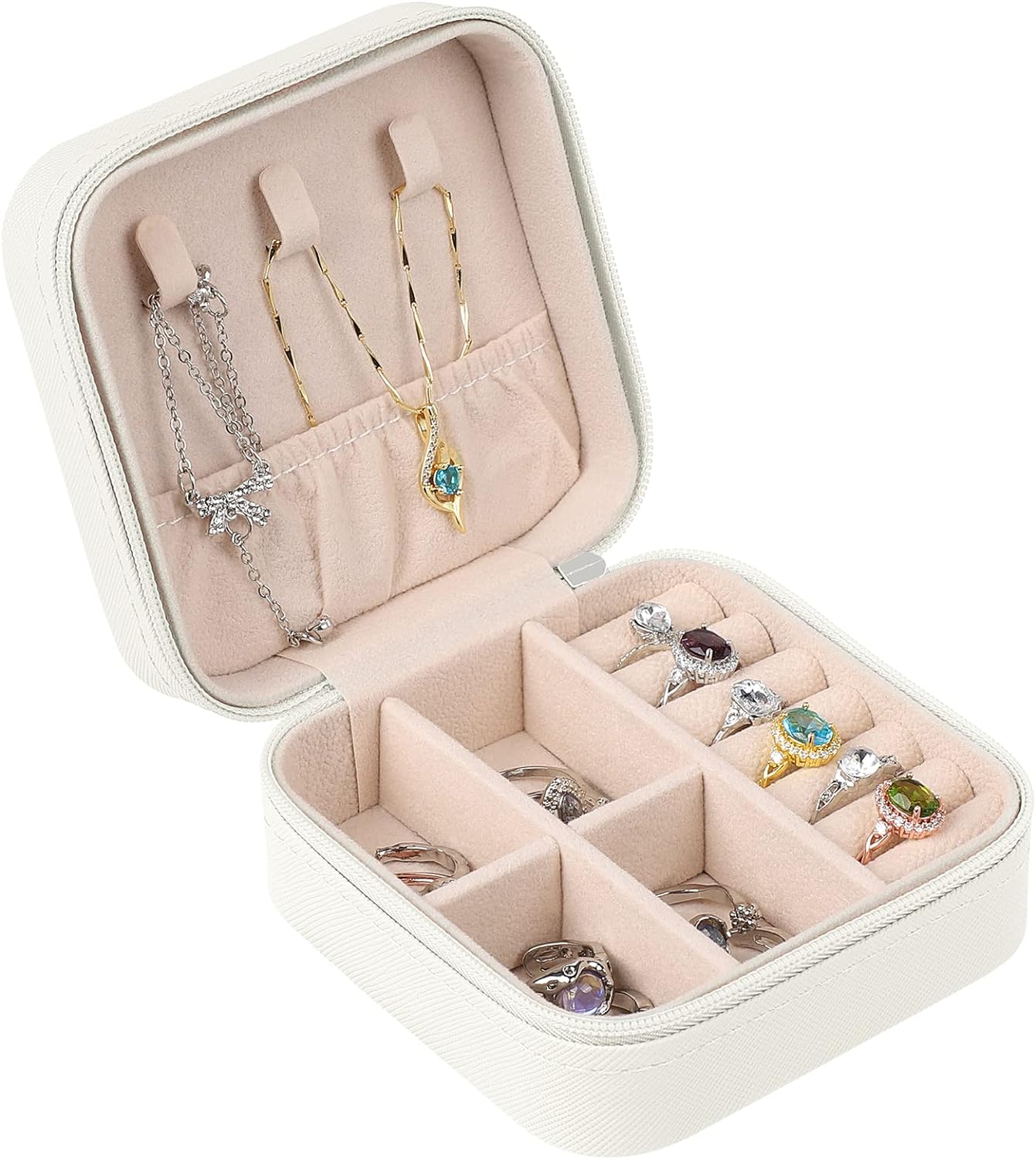 Elegant and durable: The outside of the jewellery organizer is wrapped by a PVC surface, which is wear-resistant and sturdy. Soft flannel inside protects your jewellery from dust and scratches. Together with the smooth zipper and exquisite workmanship, the white jewellery box is a perfect choice for you.