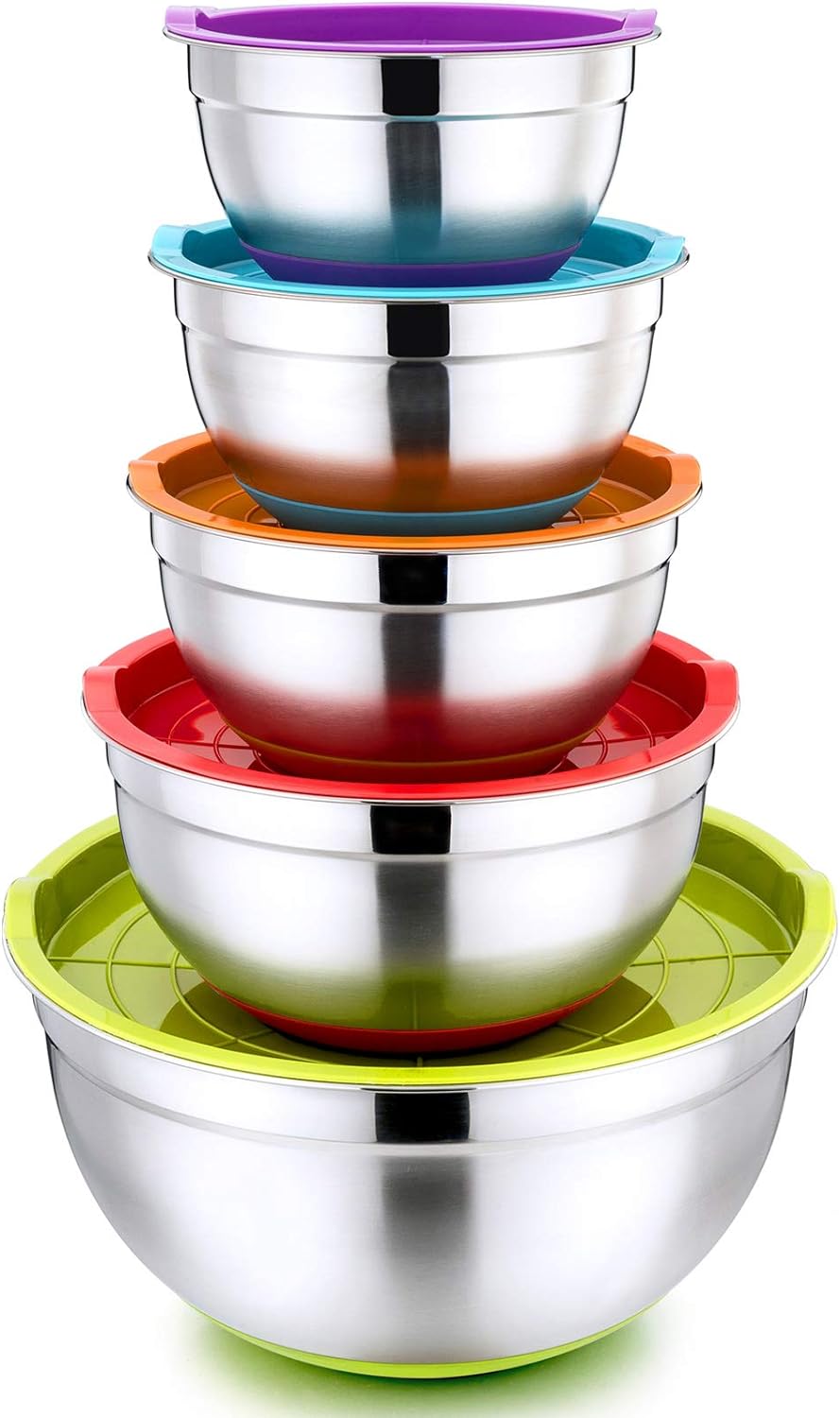 🎁【GREAT GIFT】5 salad bowls with 5 colored lids and bottoms, green, blue, red,orange and purple, Smooth and wide rim offer comfortable grasp, Outside brushed surface will not leave fingerprints to keep its elegant appearance, Suitable for refrigerator,freezer and kitchen cabinet, Utility set to go to as good gift for housewarming,Christmas,Birthday and Wedding