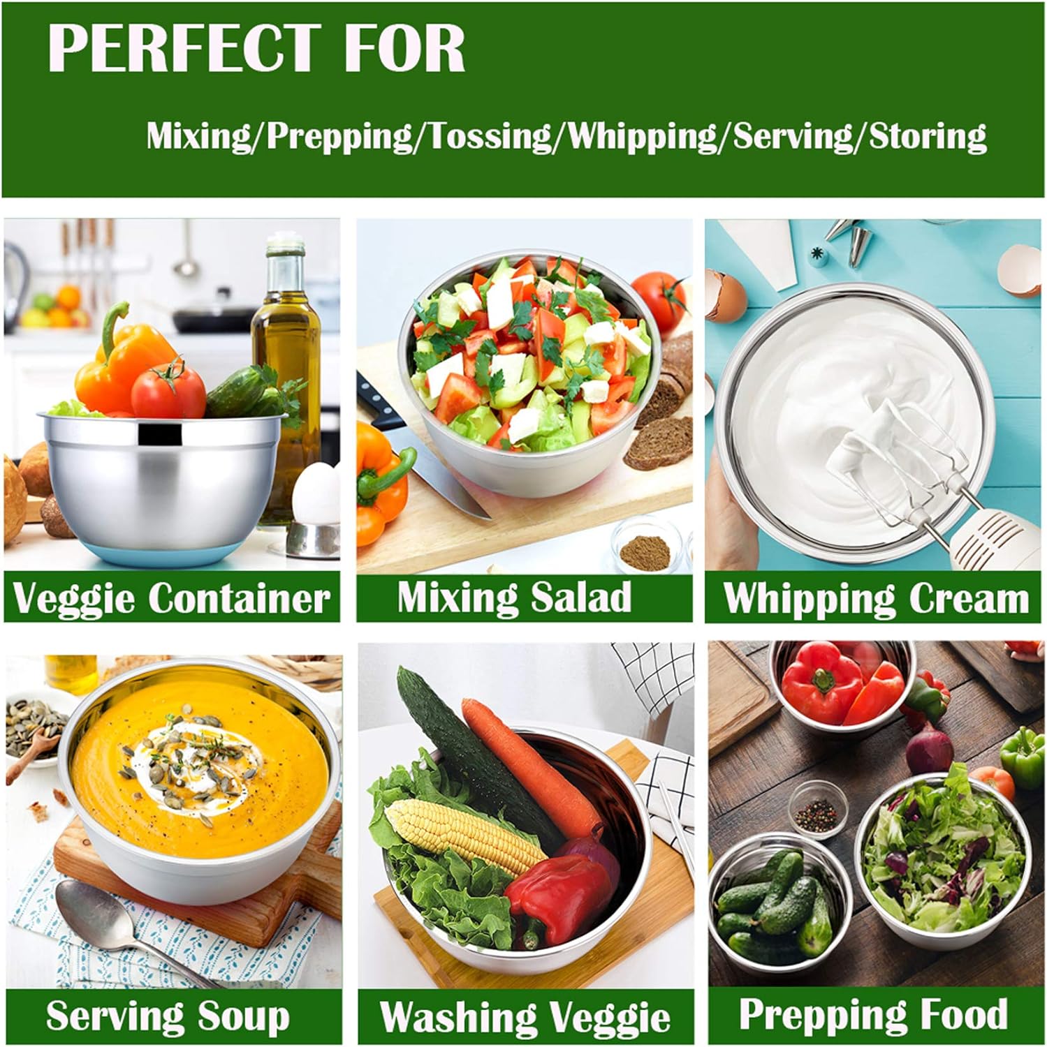 🎁【MULTI USE】This mixing bowl set comes with 1.5, 2.5, 3, 5, 8 quart, 5 different size bowls have multiple usages on your home kitchen, restaurant and canteen, like prepping food, storing leftover, or mixing salads, beating egg or serving soup, Each bowl inside marks measurement unit in QT and L, that is perfect to meet your different measurement needs