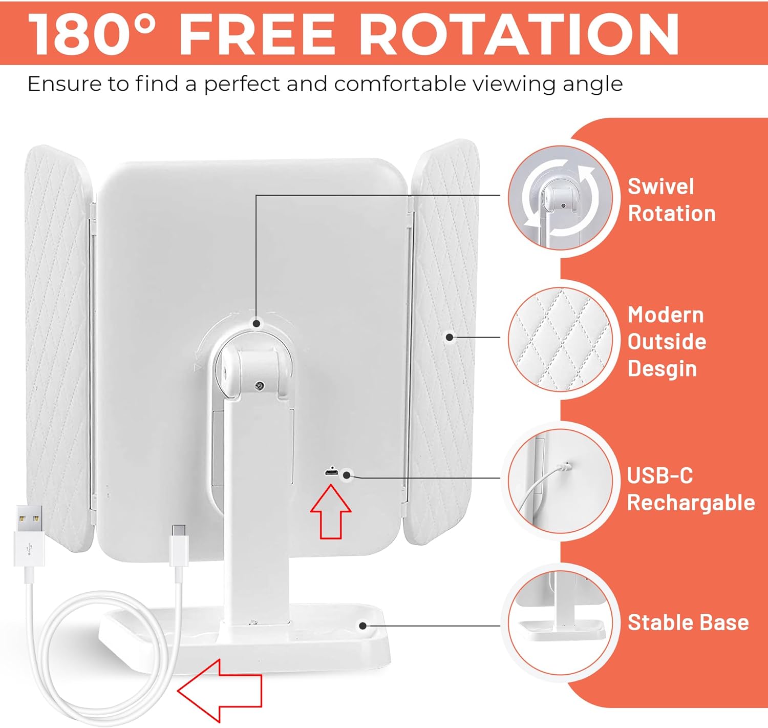 USB-C Cable: Easy & Fast Charging: Modern technology requires modern solutions. Thanks to the included USB-C cable, your make-up mirror is always ready to use and charged in a flash.