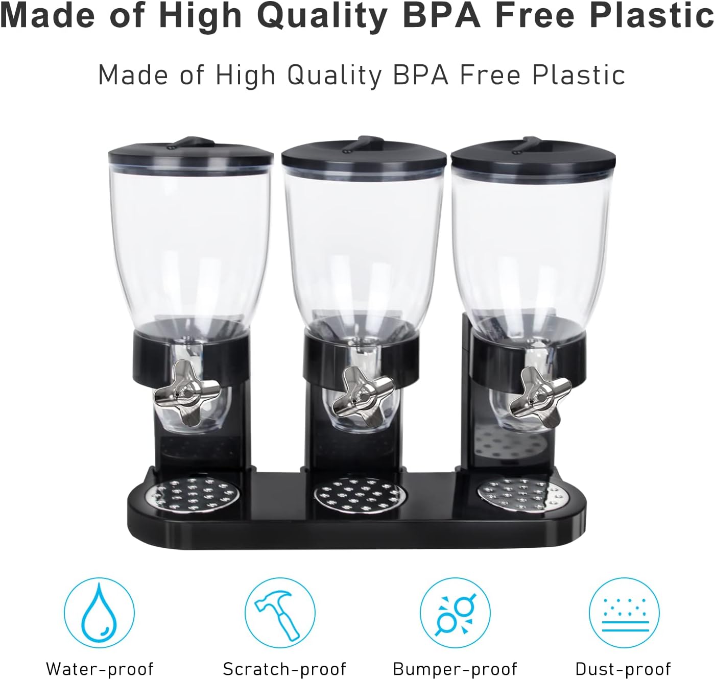 ?LAGRE CAPACITY?Total 3 x 2L capacity buckets that dispense exactly 1 ounce per twist, which can allow you to serve the perfect amount for your family no matter how much the ingredient is. Satisfy your kinds of needs to preserve your kinds of food.