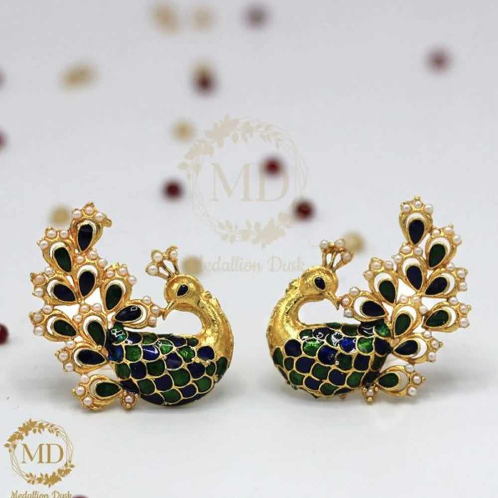 These exquisite Medallion Dusk- Statement Blue and Green Peacock Earrings feature a stunning combination of blue and green hues, making them a statement piece for any outfit. Crafted with expert precision, these earrings showcase the natural beauty of peacock feathers. Enhance your style with a touch of elegance and sophistication.